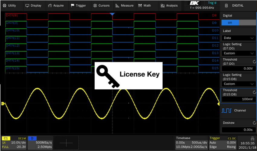 The MSO software option enables the 16 digital channels on the 2565B, 2567B, and 2569B digital oscilloscopes. Measure TTL, CMOS, or custom logic levels along side analog channels. Please fill out the request form to acquire a license for the MSO option.